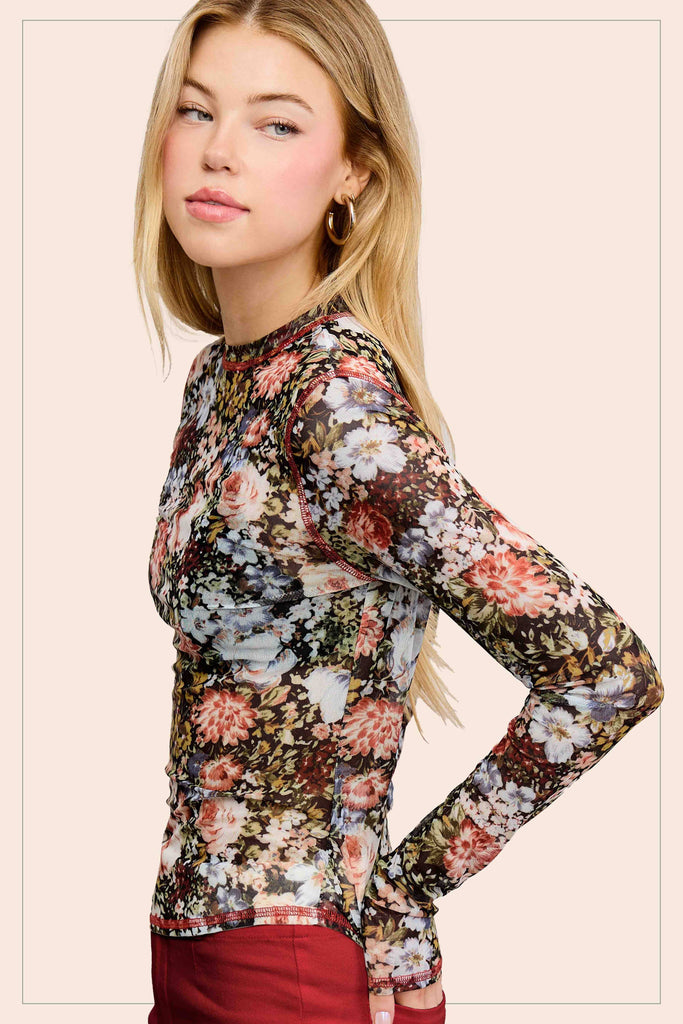 Perfect for layering, this mesh top is featured in a semi sheer design with floral pattern, fitted long sleeves, crew neckline and stretchy fabrication with exposed stitching. This simple top is the perfect lightweight layer throughout all season. Layer up or style solo for a variety look.
