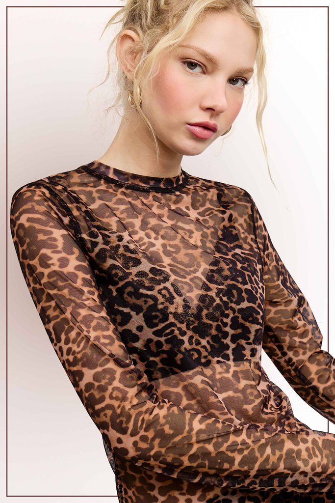 This long-sleeve sheer top is a must-have for your wardrobe! It features a chic leopard print, giving you a bold and trendy vibe. The lightweight, transparent fabric makes it perfect for layering over your favorite bralette or cami, adding a touch of elegance to any outfit. Designed with a classic crew neck and a flattering fitted silhouette, this top is versatile enough for both casual outings and evening events. Pair it with a sleek skirt or high-waisted pants to elevate your style effortlessly!